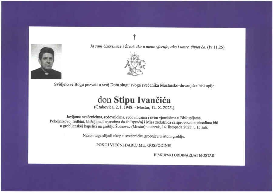U nedjelju, 12. listopada 2025., u Mostaru je preminuo don Stipe Ivančić, umirovljeni svećenik Mostarsko-duvanjske biskupije. Ispraćaj i Misa zadušnica sa sprovodnim obredima bit će u grobljanskoj kapelici na groblju Šoinovac (Mostar) u utorak, 14. listopada 2025. u 15 sati. Nakon toga slijedi ukop u svećeničku grobnicu u istom groblju. Njegovu dušu preporučimo u molitve.
