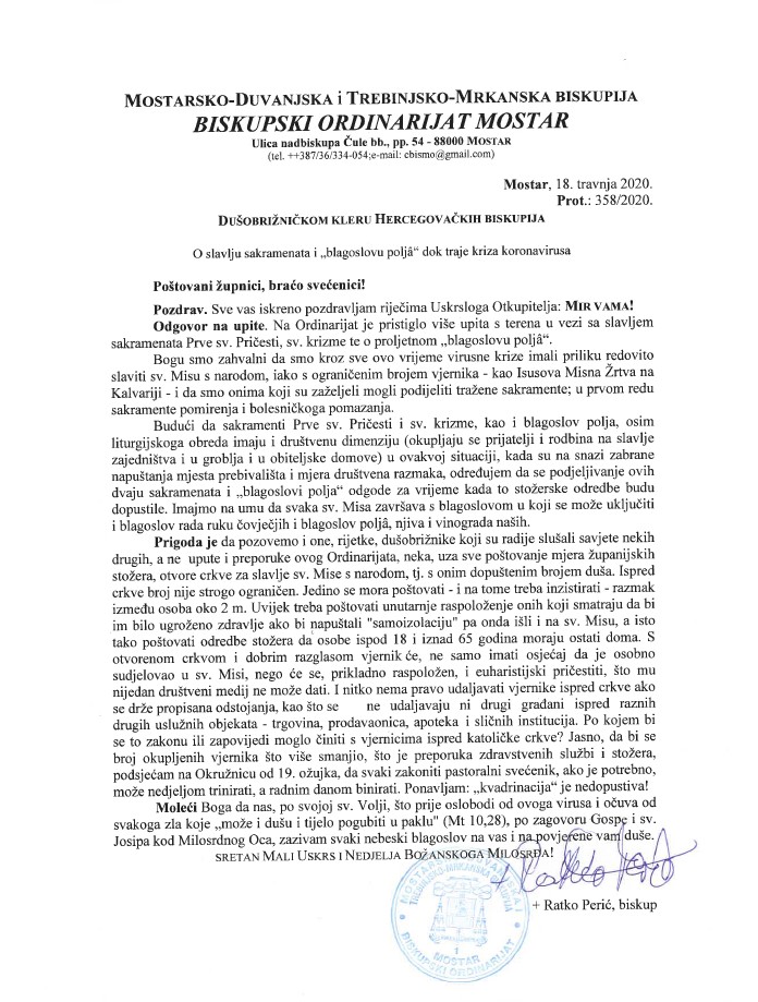 Po biskupovoj odredbi sakramenti Prve sv. Pričesti i Krizme, kao i blagoslovi polja se odgađaju, zbog okolnosti u kojima se nalazimo.